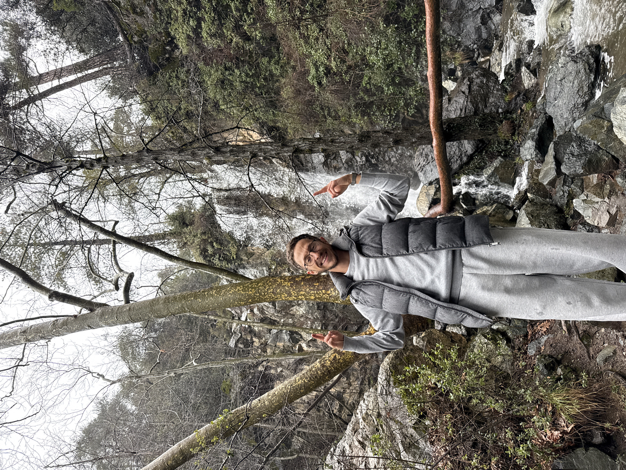 man standing near a waterfall. The man is wearing a gray tracksuit and a gray puffer vest, and he is making a peace sign with both hands. The waterfall is surrounded by rocks and trees. The location appears to be in a natural, possibly forested area with visible rock formations. The scene is likely near Pano Platres, Cyprus, given that this is where the image was taken.