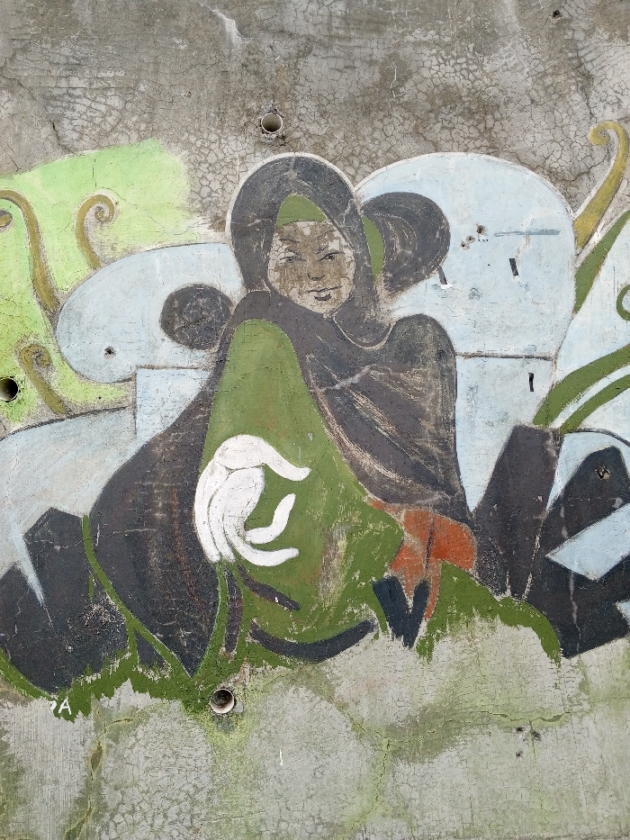 A weathered concrete wall in Voa Yeav, Cambodia, features a faded multi-colored mural. The central subject is a stylized, front-facing figure with a light-toned face, dark eyes, and a slight smile. The figure wears a dark brown or black hooded garment draped over a prominent green tunic. A white, stylized, five-pronged object, resembling either a hand or a flower, is depicted held on the left side of the green tunic. Surrounding the central figure are various abstract and organic shapes. To the left, light green and yellow swirling forms are visible against a light blue-grey background element. To the right, additional light blue-grey shapes, including one with a dark circular center, appear alongside green leaf-like elements and a curved yellow form. Patches of orange and black are integrated into the lower portions of the mural. The paint of the mural is significantly chipped, faded, and cracked, revealing the underlying rough, gray concrete. The concrete wall itself exhibits extensive weathering, including numerous fine cracks and irregular patches of greenish discoloration, consistent with moss or mold growth, particularly along the top and bottom edges. Three distinct circular holes are present in the concrete: one above the figure's left shoulder, one to the lower left of the figure, and one at the bottom edge directly below the white object. A small, dark "A" is faintly visible as a signature at the bottom left corner of the painted area.