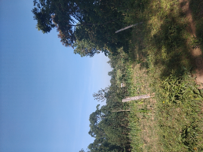 A landscape view reveals a dense forest bordering a field. The sky is a clear, pale blue, partially framed by verdant treetops. The field displays a mix of vegetation, including cultivated plants and wild grasses. Fencing materials, possibly wooden posts, are scattered throughout the field, suggesting a boundary or enclosure. A hint of soil is visible, indicating earth paths within the landscape.