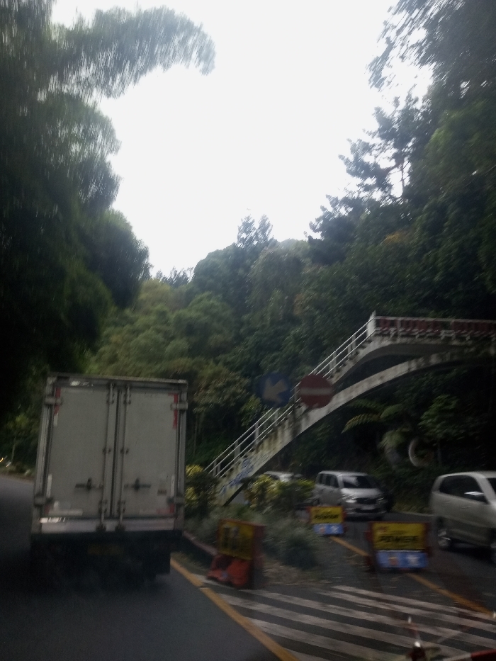 This image depicts a section of a paved road in Jabalpur, India, alongside a steep, heavily vegetated hillside under an overcast sky. In the immediate foreground on the left, the rear of a large, light-colored box-style cargo truck is visible, facing away from the viewer. The truck features two prominent vertical rear doors with visible latches. To the right of the truck, along the road's edge, multiple orange and yellow temporary road barriers are placed, some bearing blue and yellow signage. The road surface includes distinct white striped markings, possibly indicating a pedestrian crossing or a temporary lane. In the midground, a white concrete pedestrian overpass or footbridge arches over the road from the right side, with white railings and a set of descending stairs visible. Affixed near the bridge structure are two circular road signs: a "No Entry" sign (red circle with a white bar) and a blue sign with a white left-pointing arrow. Several light-colored passenger vehicles, including what appear to be silver vans or cars, are parked or moving slowly behind the barriers and under the bridge. The background is dominated by a dense, green forest covering a steep hillside that rises sharply from the right side of the road and extends across the upper portion of the frame. The sky is significantly overexposed and white, indicating bright, diffuse light, with some blurring apparent in the upper foliage. No individuals are clearly visible.