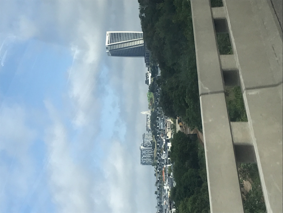 An eye-level shot of a cityscape under a cloudy sky. A tall, slender building with a unique design stands out among the other structures. Lush green trees line the streets, adding a natural element to the urban landscape. A grey, concrete structure with rectangular openings runs along the right side of the frame, providing a different perspective on the city.