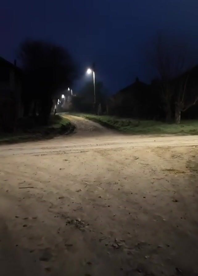 The video depicts a dark, rural scene at night. The camera is stationary, providing a ground-level view of a dirt road. Streetlights illuminate the road, casting a pale glow that reveals its uneven and textured surface. The sky is a deep blue, indicating either late evening or early morning. Silhouetted buildings flank either side of the road, partially obscured by trees. There are no visible people or moving objects in the frame. The overall atmosphere is quiet and still, conveying a sense of remoteness.