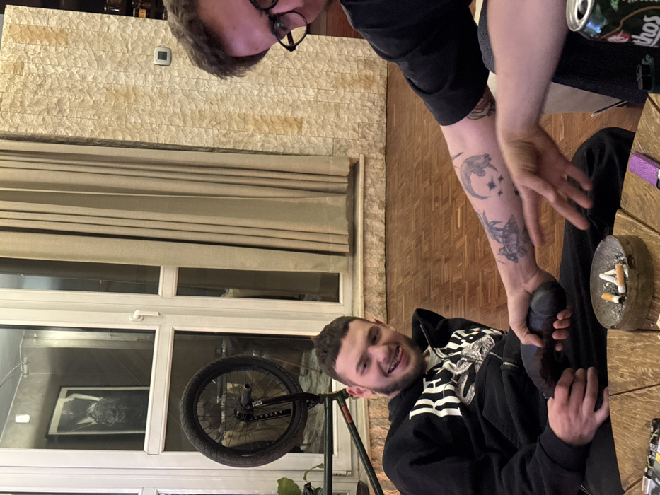 The scene depicts an indoor living space in the city of Unknown, Unknown, featuring two adult males in a casual setting. The room has polished wooden parquet flooring and a large, white-framed, multi-pane glass door or window unit, partially covered by beige vertical curtains. A light-colored, textured wall with vertical patterning is visible on the right. In the foreground, a low, slatted wooden table holds a round ashtray containing several cigarette butts and ash. A purple patterned lighter and other small metallic items are also on the table. One male, positioned to the left, is seated on the floor, facing the viewer with a broad smile, showing visible dental braces and a slightly extended tongue. He has short, dark hair and a beard, wearing a black hooded sweatshirt with white graphic text. His left hand firmly grips a dark, elongated, bulbous object. The second male is partially visible on the right, comprising his forehead with dark-framed eyeglasses, and his left arm. He wears a dark short-sleeved shirt. His left forearm displays multiple tattoos, including a crescent moon with an animal and a separate tattoo of a sea turtle under a palm tree. His right hand is positioned with fingers splayed near the object held by the first individual. An open can of 'Mythos' beer rests on the floor beside him. In the background, against the window, a black BMX bicycle wheel and a portion of its frame are leaning. A framed black and white artwork is visible, reflected in the upper portion of the window.