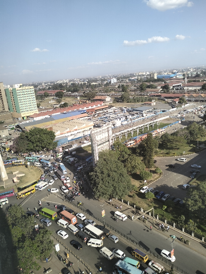 An aerial view shows a sprawling urban landscape under a bright sky. In the foreground, a busy intersection teems with vehicles, including buses, cars, and vans, creating a traffic jam. Adjacent to the road, a green patch with trees adds a touch of nature. Beyond the intersection, a bus station and a multi-story building are visible. The horizon is filled with a mix of low-rise structures and scattered taller buildings, blending to create a densely populated city.