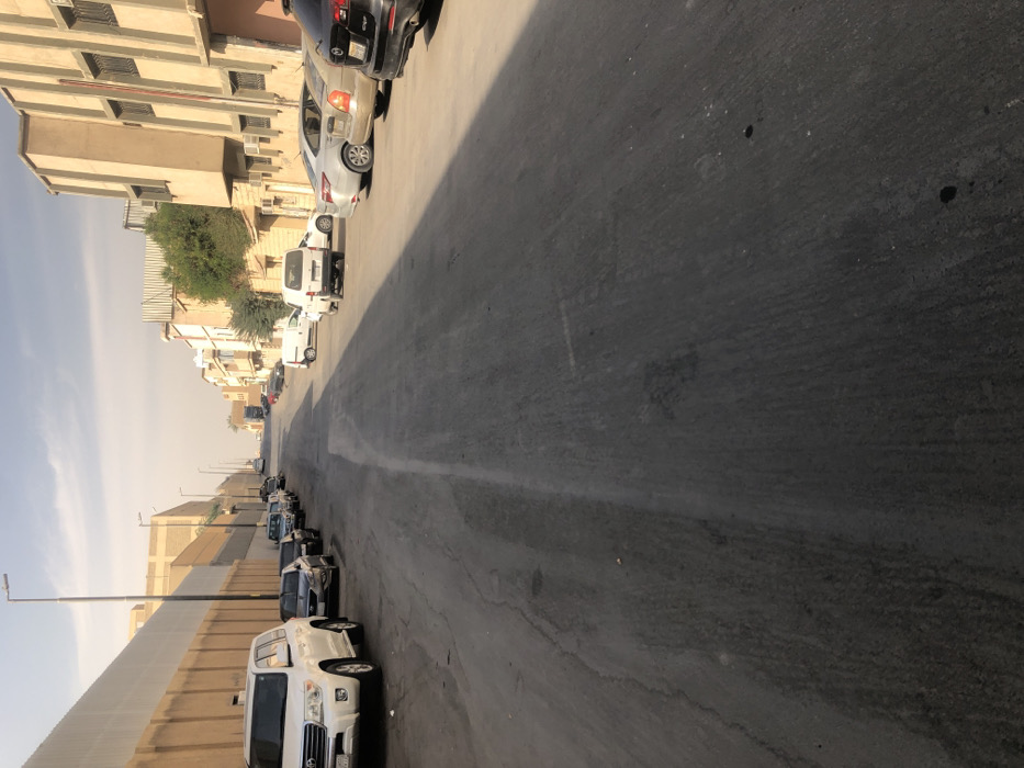 The image displays a static, outdoor street scene in a commercial or industrial district of Riyadh, Saudi Arabia, captured during daytime under a hazy sky