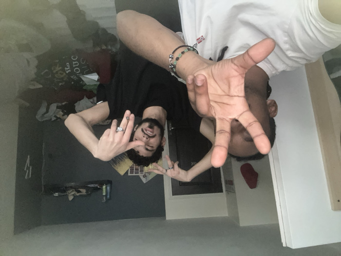 This image depicts two males posing in a casual indoor environment, reportedly located in Marcoussis, France, although this specific geographic location is not visually verifiable from the image content. In the immediate foreground, positioned to the left, is a male with dark skin. His face is largely obscured by his right hand, which is held forward towards the camera with fingers splayed open. He is wearing a white short-sleeved t-shirt with a small emblem on the left chest and a bracelet composed of green and black beads on his right wrist. Dark hair, appearing to be styled in dreadlocks or braids, is visible. Behind and slightly to the right of the first individual, a second male is prominently featured. He has light brown skin, dark curly hair, and a beard. He wears a black t-shirt and silver rings on his right hand. His eyes are partially closed, and his mouth is slightly open. He is actively posing with both hands: his left hand (viewer's right) is raised near his head with the index and pinky fingers extended, while his right hand (viewer's left) is held outward, forming a "V" shape with extended index and middle fingers. The background reveals a room with contrasting wall sections. To the left, a white wall or partition is visible, against which a light-colored wooden board is leaning. A red cloth object hangs on this white wall. To the right, the wall is painted a dark blue-gray. Mounted on this darker wall is a dark wall shelf holding various small items, including what appears to be a spray bottle. Below the shelf, a distinct white lightning bolt symbol is present on the dark wall. Further left on the dark wall, abstract yellow and black graphic elements are visible. The lower right portion of the background contains an unorganized accumulation of clothing and other miscellaneous objects on what appears to be a floor or surface.