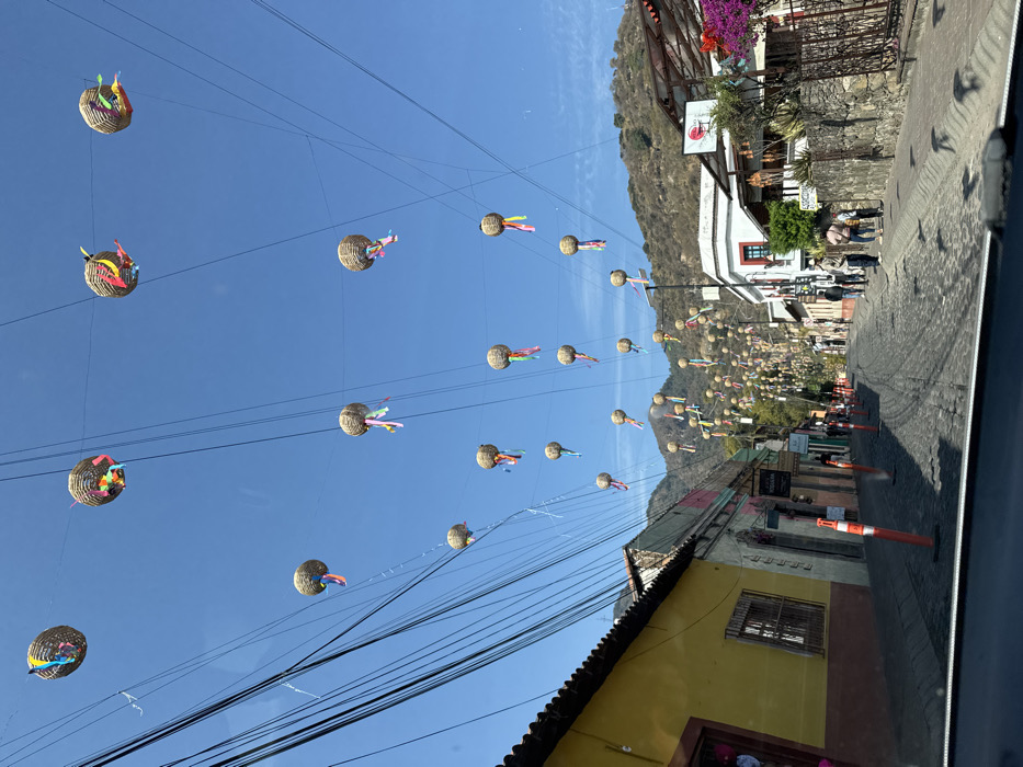 A street scene is shown with strings of woven orbs suspended overhead. The orbs have colorful ribbons or streamers attached. Buildings line either side of the street, with some showing colonial architecture. Mountains are visible in the background. Orange traffic cones are placed along one side of the road. Power lines run parallel to the strings of orbs. The sky is clear and blue.