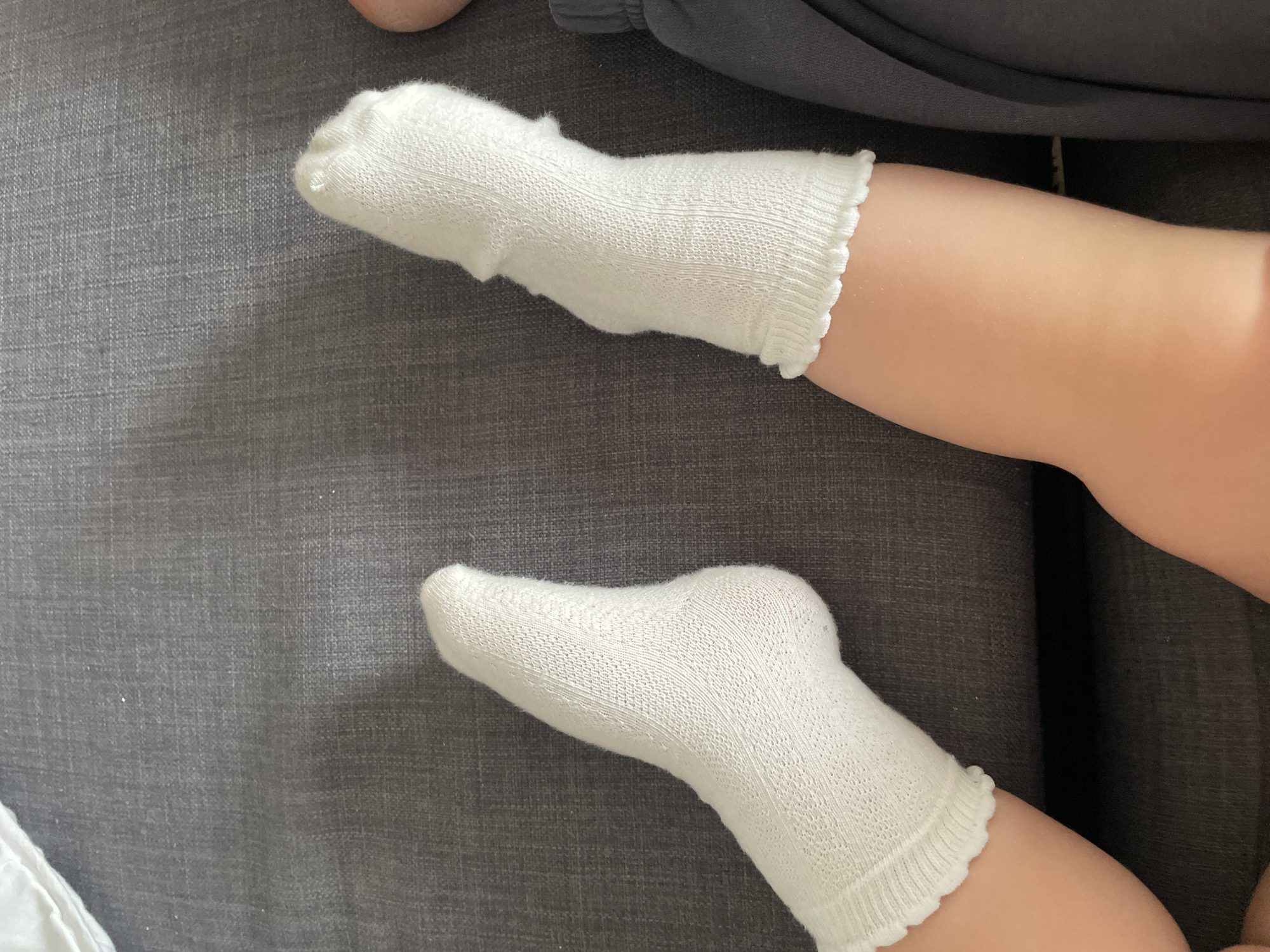An overhead, close-up image depicts two bare, light-skinned human legs and feet, identified as being in Senden, Germany. Both feet are clothed in white, knitted ankle socks featuring a ruffled cuff. The socks display a textured or waffle-knit pattern. The legs are positioned on a dark gray, textured fabric surface, likely upholstery. The left leg extends diagonally towards the upper left, while the right leg is partially visible on the right side of the frame. A piece of dark gray fabric, consistent with clothing, is present alongside the right leg. No explicit actions or interactions beyond resting are observable. The environment appears to be an indoor domestic setting.