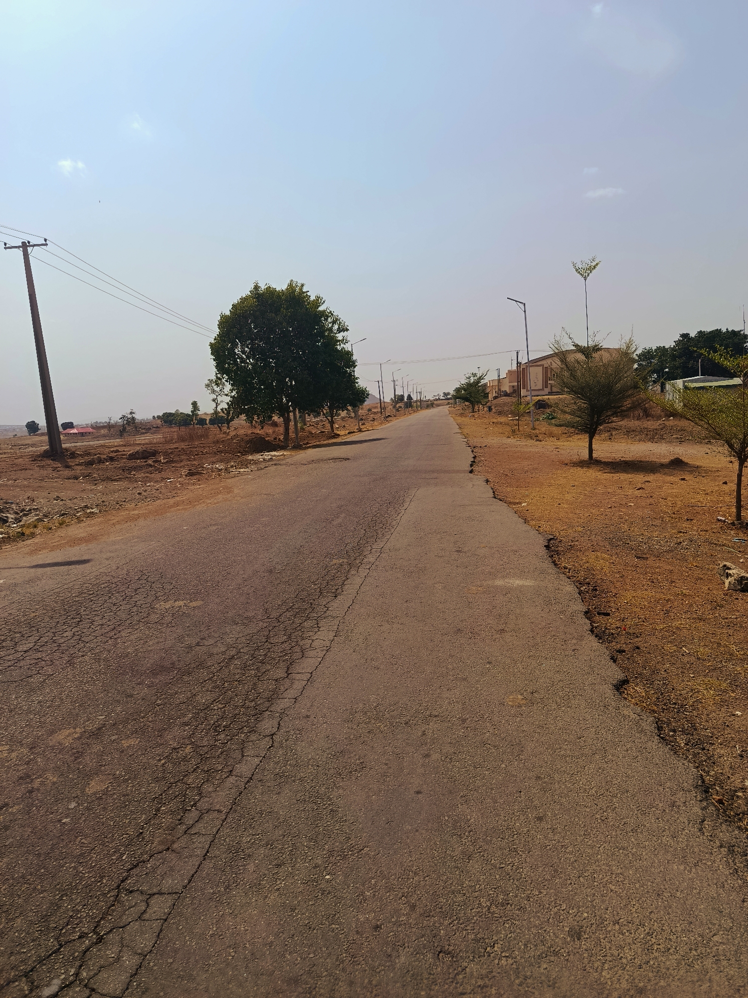 The image depicts a straight, asphalt road stretching into the distance, possibly within the city of Rafin Pa, Nigeria. The road shows signs of wear and cracking, particularly on the left side. The roadside on both sides is characterized by dry, brown vegetation and sparse trees. A utility pole with power lines is visible on the left side of the road. Further down the road, street lights are spaced intermittently. Buildings can be seen in the distance on the right. The sky is a clear, pale blue. There are no people visible in the image.