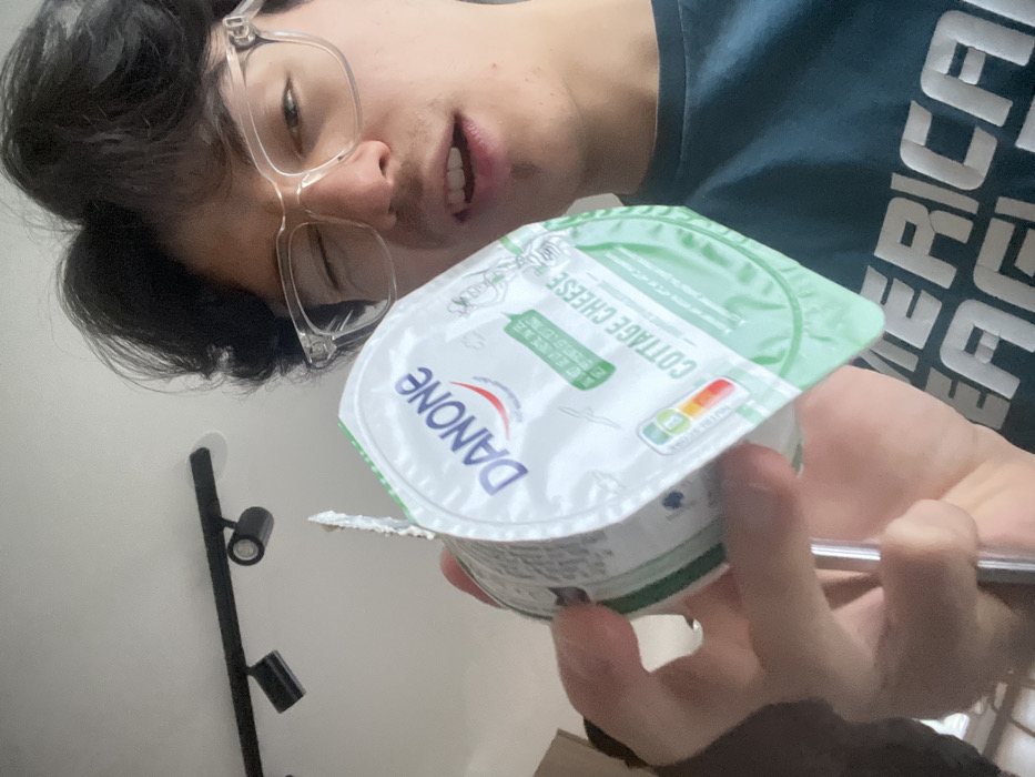 The image displays a young male subject in an indoor setting, identified as Villeneuve-d'Ascq, France. The male, with dark, wavy hair and wearing clear-framed eyeglasses, is clad in a dark-colored t-shirt with "AMERICAN EAGLE" text partially visible. His right eye is closed in a wink, and his mouth is slightly open. He is holding a white and green plastic cup of Danone Cottage Cheese in his left hand, positioned centrally in the frame and partially obscuring his lower face. The lid of the cottage cheese container is partially peeled back, revealing the white product within, and a silver spoon or utensil is visible inside. The product label clearly displays "DANONE" and "COTTAGE CHEESE," along with a Nutri-score 'C'. The background is a plain, light-colored ceiling equipped with a black track lighting fixture featuring multiple spotlights.