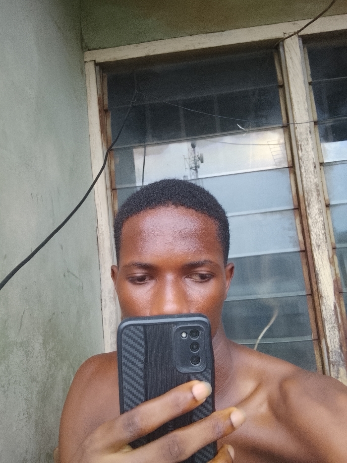 A young, shirtless man with dark skin takes a selfie, holding a smartphone with a black textured case. He looks at the phone screen. Behind him is an old, multi-paned window, reflecting a communication tower. A dark electrical wire runs down the wall to the left. The wall is a muted green color, contrasting with the weathered white trim of the window.