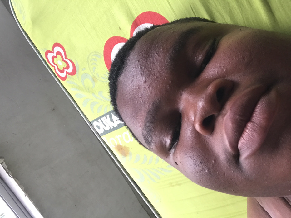 A close-up, angled image taken indoors in Ado, Nigeria, features an individual reclining