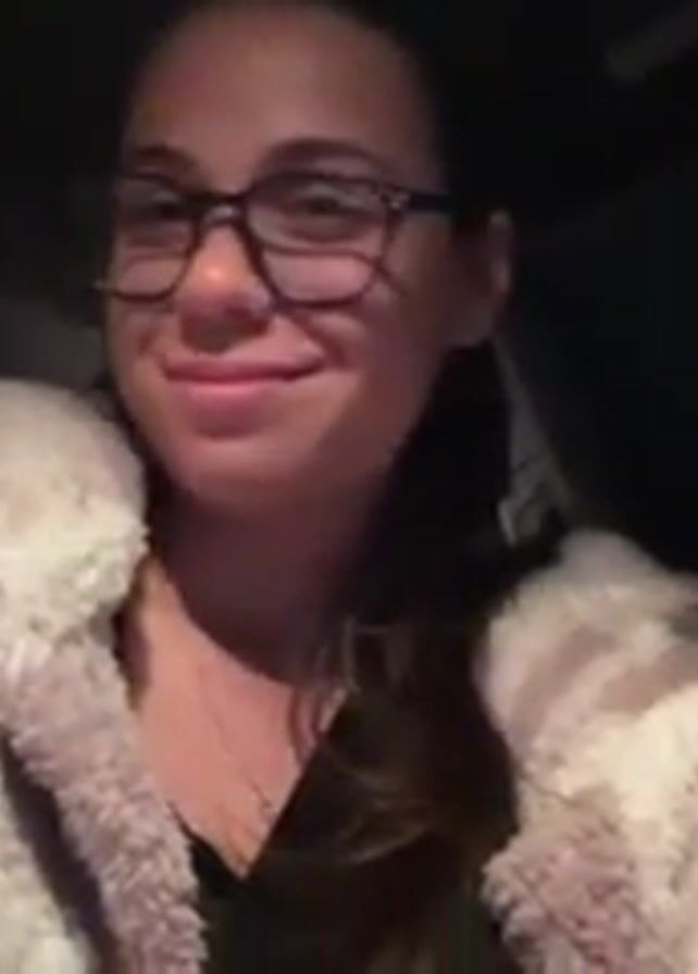 A woman in a car looks at the camera, smiles, and laughs. She is wearing glasses and a light-colored fuzzy jacket. It is nighttime. There is a person out of focus in the background.