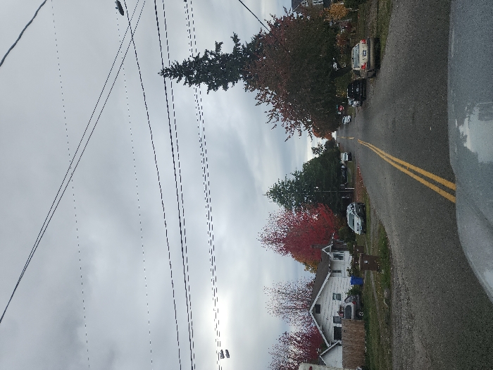 The image displays a residential street in Tacoma, United States, observed from a low perspective, likely from a vehicle. The sky is uniformly overcast and grey, with multiple utility wires spanning the upper frame. An asphalt road, marked with double solid yellow center lines, extends into the distance with a gentle uphill grade. On the left side of the road, a white single-story house is partially visible behind a wooden fence. A silver minivan is parked on the unpaved verge in front of the house, adjacent to two dark-colored refuse bins. Several trees with bright red and dark green autumn foliage are prominent on this side. On the right side, a tall, dark green coniferous tree stands out among other trees displaying fall colors. Further down the street, at least two sedans—one dark and one tan—are parked on the unpaved verge. Additional vehicles, including a white truck, are visible further in the distance. No individuals are present or engaged in any activity within the scene.