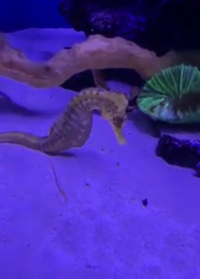 A seahorse stands on a blue sand floor in a fish tank. Behind the seahorse is a wooden branch and a green, umbrella-shaped plant. There are dark rocks visible. The seahorse is brown with spots. It stands still and moves slightly with the current. Murmurs of people speaking in the background can be heard.