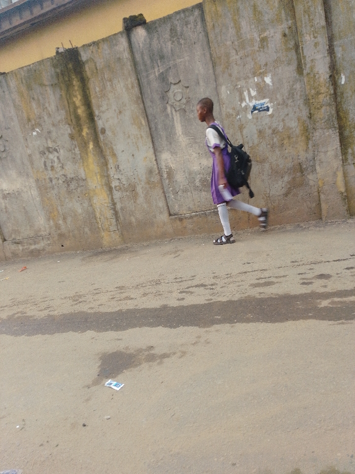 A young person wearing a purple dress, white socks, and black sandals walks along a sidewalk beside a weathered concrete wall. A black backpack is slung over their shoulder. The ground is asphalt with darker, possibly wet patches and some scattered debris. The scene appears to be in a somewhat urban or residential area.
