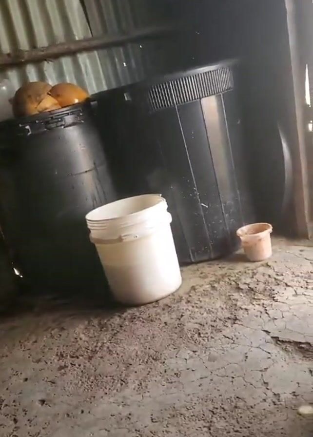small, enclosed space. The walls are corrugated metal, and there is a wooden beam running along the top of one wall. Several black barrels are visible, with two coconuts on top of one. Three white buckets of varying sizes are also present, along with a couple of small plastic cups, one containing liquid. A dark bag hangs from the wooden beam. The floor is concrete with a scattered pattern of dirt. The lighting appears to be natural, coming through an opening in the space. The video is shaky, suggesting it was filmed by hand.