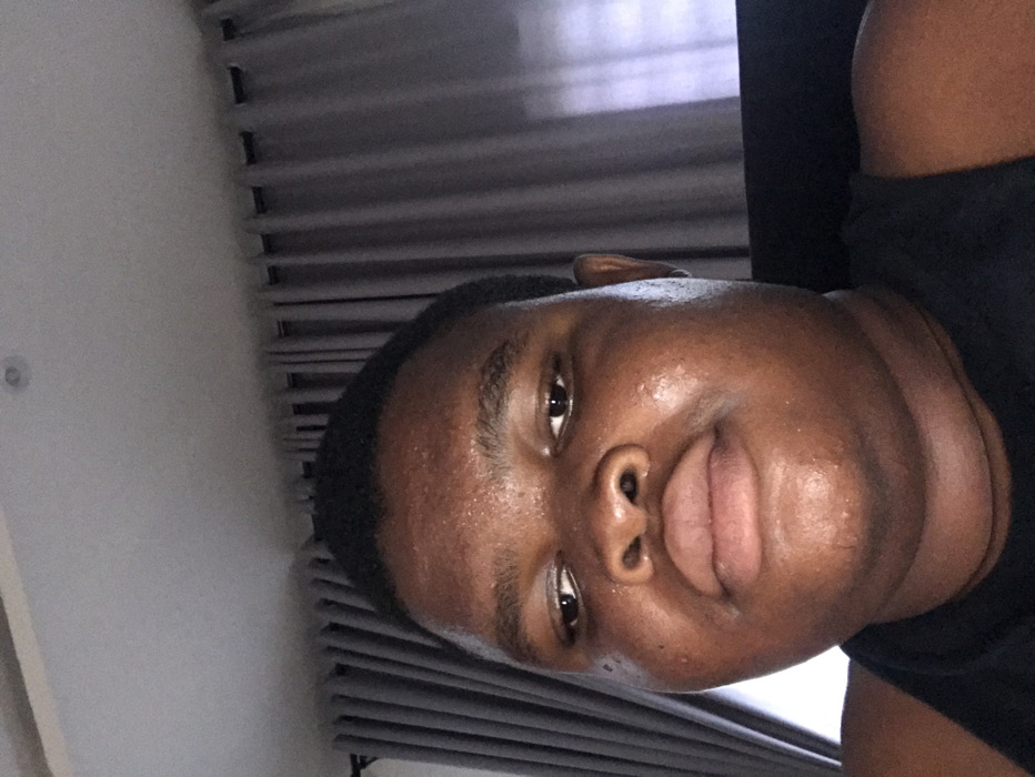 A man's face fills the frame, appearing slightly damp or sweaty. He has dark skin, short black hair, and is wearing a black shirt. His lips are full and slightly parted, suggesting a relaxed expression. The background consists of a light-colored wall and grey horizontal blinds. The camera angle is slightly tilted.