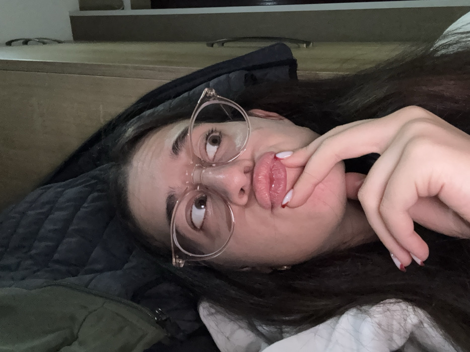 The image displays a close-up indoor portrait of a young woman with long, dark hair and clear-framed eyeglasses. Her lips are pursed in a pout, and her right index finger, adorned with a white manicure featuring red tips, touches her lower lip. Her gaze is directed towards the viewer's right. In the cluttered background to the left, a dark, quilted jacket hangs, with a lighter green garment partially visible above it. To the right, a light brown wooden cabinet or wardrobe with a dark handle is present. A white, textured fabric, likely a blanket or pillow, is visible on the lower left. The specific location within Tbilisi, Georgia, cannot be identified from the visual details provided.
