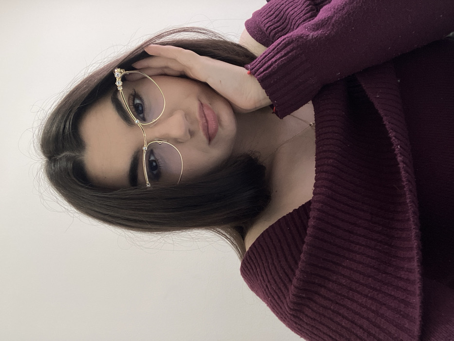 A young adult female with dark hair and dark eyes is depicted from the upper chest upward, looking directly at the camera. She wears a dark burgundy, ribbed, off-the-shoulder sweater. Her face is framed by gold-colored eyeglasses with clear lenses and decorative clear rhinestones on the outer upper corners. A thin gold chain necklace with a small pendant is visible at her sternum. Her left hand is raised, with fingers resting against her left jawline/cheek, and a thin red string or cord is visible on her left wrist. The background is a plain, solid light-colored wall. The specific location within the city of Plovdiv, Bulgaria, cannot be determined from the visual information provided in the image.