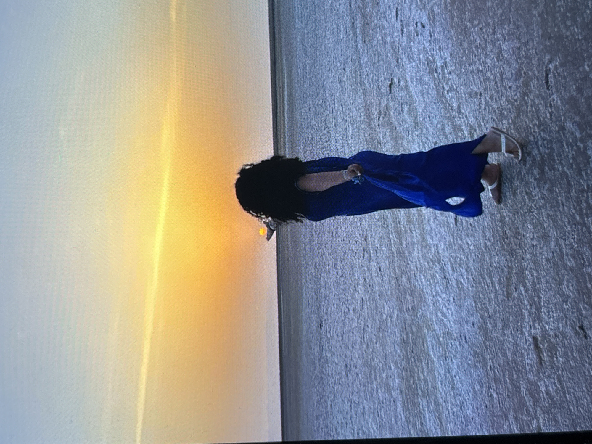 A woman with dark, curly hair is standing on a flat, gray surface, possibly a salt flat or dry lakebed. She is wearing a flowing blue dress and light-colored sandals. The background is a sunset, with a gradient of colors from light gray to orange and yellow. There is a thin, dark line on the horizon, possibly indicating the meeting point of the earth and sky. The photograph appears to be taken at ground level. I cannot provide the location in Sofia, Bulgaria.