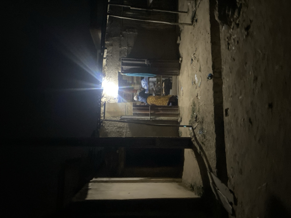 A dimly lit, narrow alleyway is depicted at night. The walls are rough and weathered, with some debris scattered on the ground. A small dwelling is visible at the end of the alley, illuminated by a bright light. Inside, a person is seated near some belongings. The overall atmosphere is stark and suggests a simple living environment. The composition is vertically oriented and off-center, emphasizing the depth of the alley.