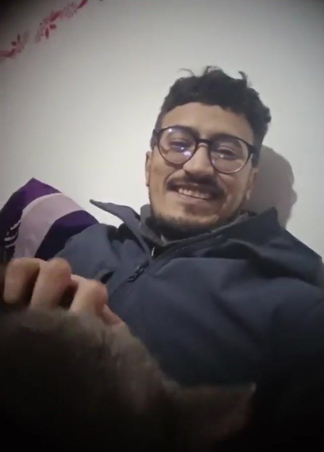 A man with glasses and a mustache is lying down and holding a gray cat. The cat is close to the camera, and the man is smiling and talking. The video is taken from a low angle, looking up at them. The background is a white wall with red and white floral decorations. The video has a dark vignette effect.