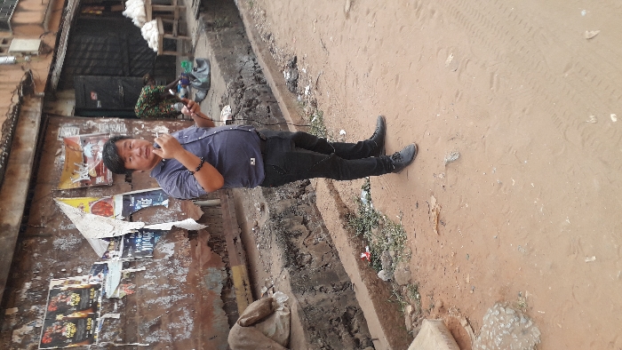 The image depicts a street scene in Onitsha, Nigeria. A male individual, appearing East Asian, stands mid-frame, oriented slightly left of the viewer. He is wearing a blue-grey short-sleeved collared shirt, black trousers, and dark shoes. A black beaded bracelet is visible on his left wrist. His right hand holds a small, dark cylindrical object near his mouth, while his left hand holds a dark rectangular device with a black cable extending from it. Behind the individual, a heavily weathered building wall, possibly constructed of corrugated metal and concrete, displays extensive rust, peeling paint, and numerous torn, faded posters and flyers. A light-colored sack rests on the ground to the left. Further down the street, to the right, a dark doorway is visible. A partially obscured person, possibly wearing a green patterned garment, stands near the doorway. Adjacent to this, a wooden stall or table holds several white, bundled items, with a dark bag resting on the ground below. The ground in the foreground and mid-ground is unpaved, consisting of reddish-brown earth with visible tire tracks and scattered debris. A shallow, unpaved trench or drain, containing litter and sparse vegetation, runs parallel to the building structure.