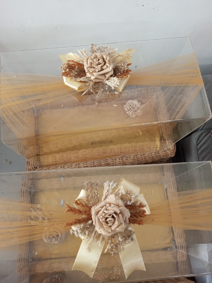 Two identical rectangular presentation boxes are stacked vertically indoors in Qarabucaq qəsəbə, Azerbaijan. Each box features a clear acrylic lid covering a light brown woven wicker basket base, which contains a yellow-gold fabric or material. The lids are adorned with elaborate decorations: a central light gold satin ribbon tied in a bow, supporting a beige fabric rose, surrounded by dried brown floral stalks and sprigs of white dried flowers. A loose length of sheer, light gold-orange tulle fabric is draped across each lid beneath the central decoration. Additionally, a smaller, single beige fabric rose is placed separately on each lid. The upper left background reveals a plain light-colored wall, while the lower right background shows a dark gray textured surface, possibly furniture. No individuals are present in the scene.