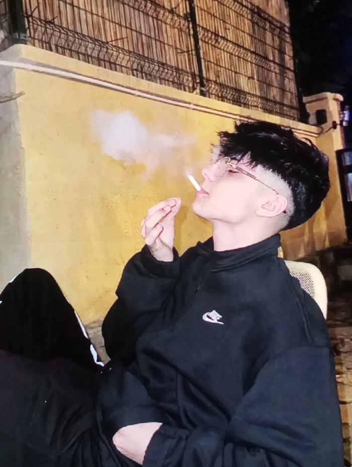 An individual is depicted seated outdoors at night in an urban setting identified as Riga, Latvia. The person, appearing young and possibly male, is shown from the mid-torso upwards, looking slightly upwards and to the right of the frame in profile. They wear a black Nike quarter-zip tracksuit jacket with the white Nike swoosh logo on the left chest, and black tracksuit bottoms with a white stripe. Gold-toned eyeglasses with a distinct temple design are worn. The individual holds a lit cigarette between the thumb and index finger of their right hand, actively exhaling a prominent plume of white smoke directed upwards and to the left. The immediate background consists of a light yellow/ochre-colored wall. Above this wall, a dark metal fence or railing featuring pointed security elements is visible. Behind the fence, another dark, textured surface is present. To the far right, a dark vertical structural element with an attached light fixture is partially visible, indicating artificial illumination in the nighttime environment.