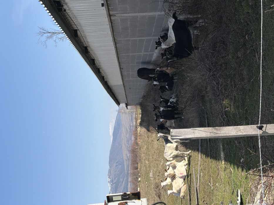The image displays an outdoor, semi-rural scene in Pirdop, Bulgaria, under a clear, bright blue sky with a faint crescent moon visible. The foreground features a wooden fence post with two strands of wire and sparse, dry ground cover mixed with patches of green grass. To the left, a portion of a white vehicle or trailer with an open panel is partially visible. In the mid-ground, a herd of approximately 20-25 domestic goats is distributed across the scene. Several white and cream-colored goats are lying down on a patch of green grass to the left, one of which exhibits pink markings on its flank. A larger group of goats, primarily dark-colored (black, brown, and spotted), stands clustered near a long, single-story utilitarian building that runs diagonally along the right side of the frame. This building has a base of concrete block walls and an upper section with corrugated metal siding and a matching roof. A single, bare deciduous tree is visible beyond the roofline. A dark-colored donkey stands near the building's wall, partially obscured by the goats. The ground around the animals is a mix of dry earth and sparse, thorny scrub. Shadows are cast towards the right, indicating a light source from the left. The background features distant mountains, some with visible snow-capped peaks, under the expansive clear sky.