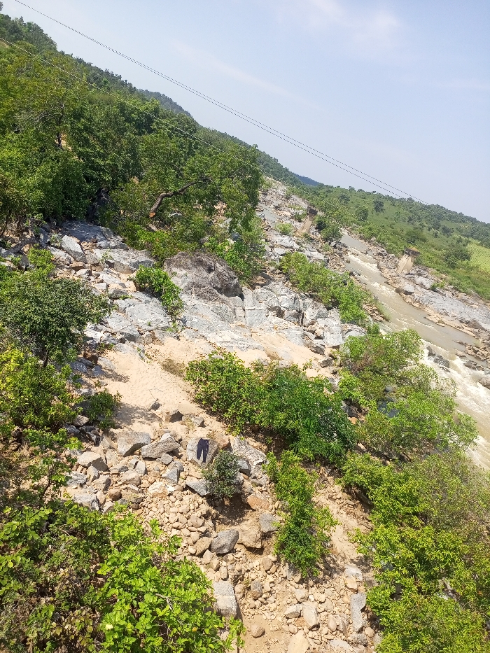 This image depicts a sloped, rocky river valley located in Akwanga, Nigeria, under a clear, light blue sky