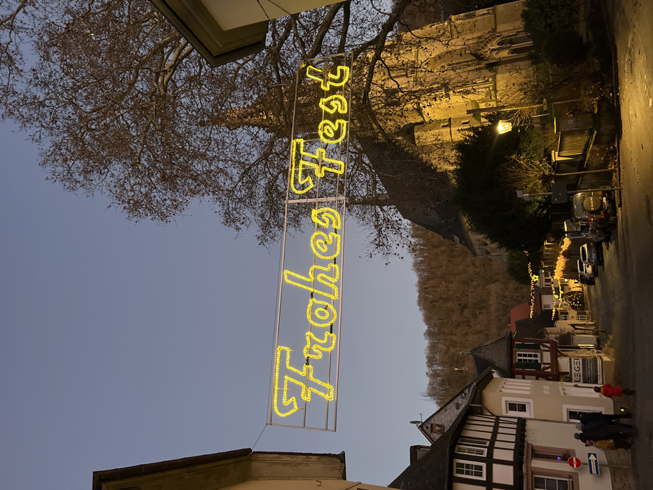 The image displays a street scene in Meisenheim, Germany, during the evening or dusk. A large, illuminated yellow sign displaying the German text "Frohes Fest" (Happy Holiday/Festival) hangs suspended across the upper portion of the street, attached to buildings on either side. On the left side of the street, a series of traditional German buildings with half-timbered facades, white walls, and dark roofs are visible. A small group of at least four individuals is walking on the sidewalk near these buildings; one person is wearing a distinctive red coat. A red circular "no entry" traffic sign is posted near this group. Further down the street on the left, other buildings show illuminated windows and another storefront sign reading "LEGER." On the right side of the street, a large, ornate stone church structure, likely Gothic in style, is prominent. Its spire is partially obscured by a large, bare deciduous tree. The church itself is illuminated by warm yellow artificial light. Several vehicles are parked along the right curb of the street, including a white SUV and a dark-colored SUV. Further down the street, additional decorative string lights are visible, along with a small illuminated Christmas tree. The street itself appears to be paved with cobblestones or similar material and slopes downward. In the background, a densely forested hillside with bare trees rises against a clear, dusky blue-grey sky. Smaller shrubs and bare trees are present along the street and surrounding the church.