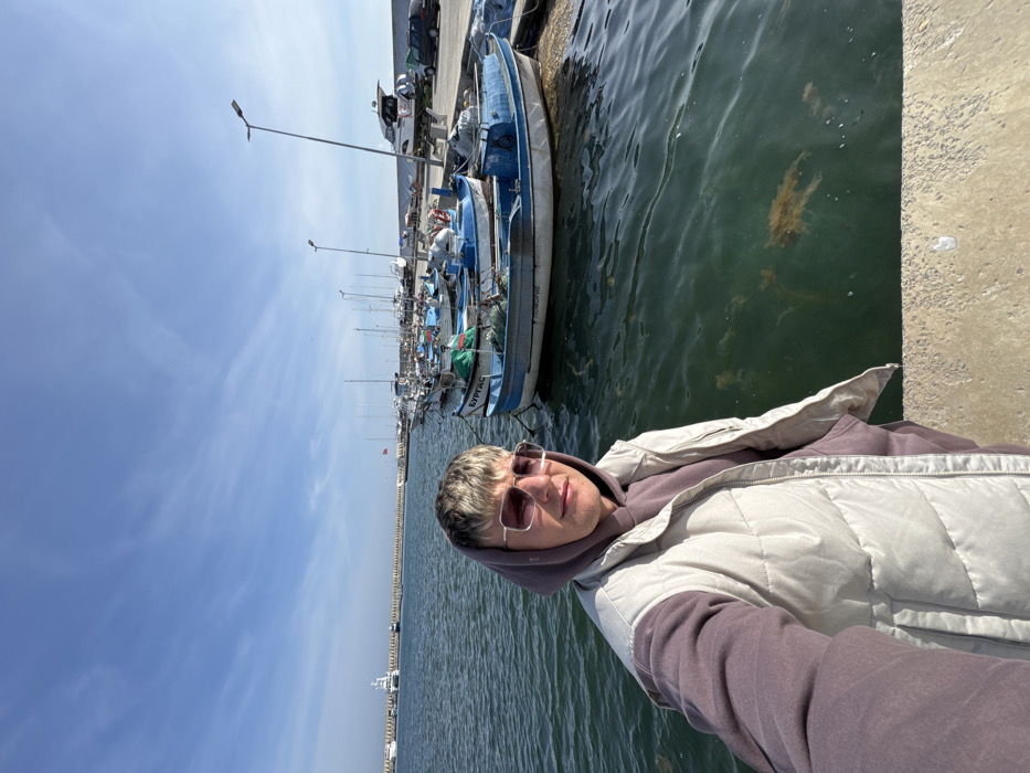A male individual is depicted in a selfie-style photograph taken at the Port of Burgas, Bulgaria, specifically a section used for smaller vessels