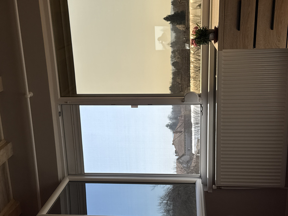 The image depicts an interior view looking outwards through a three-panel window frame on a sunny day in Polikraishte, Bulgaria. The left-most window pane is open inward, revealing a bright blue sky and the skeletal branches of a tree to its left. The central window pane is closed, with an opaque white roller screen partially lowered, exhibiting a fine grid pattern. The right-most window pane is closed, displaying a warmer, golden-hued sky, possibly due to a reflective or tinted surface, and shows a faint, indistinct reflection of a person holding a device. Below the window, a white panel radiator is centrally positioned against a light brown wall. To the right of the radiator, a wooden dresser with three drawers, each featuring a horizontal black handle, is visible. On top of this dresser, near the window, sits a small gray pot containing pink flowering plants, placed on a reddish-brown saucer. Beyond the window, the outdoor environment features multiple residential buildings with red-tiled roofs nestled amidst a landscape of bare trees, indicative of late winter or early spring. Distant hills or forested areas are visible on the horizon. The ceiling inside is light-colored, with two exposed wooden beams running horizontally and a white pipe structure traversing the upper wall. Strong sunlight casts a distinct shadow from the window frame onto the radiator and the room's interior. No individuals are clearly identifiable, though a reflection is present.