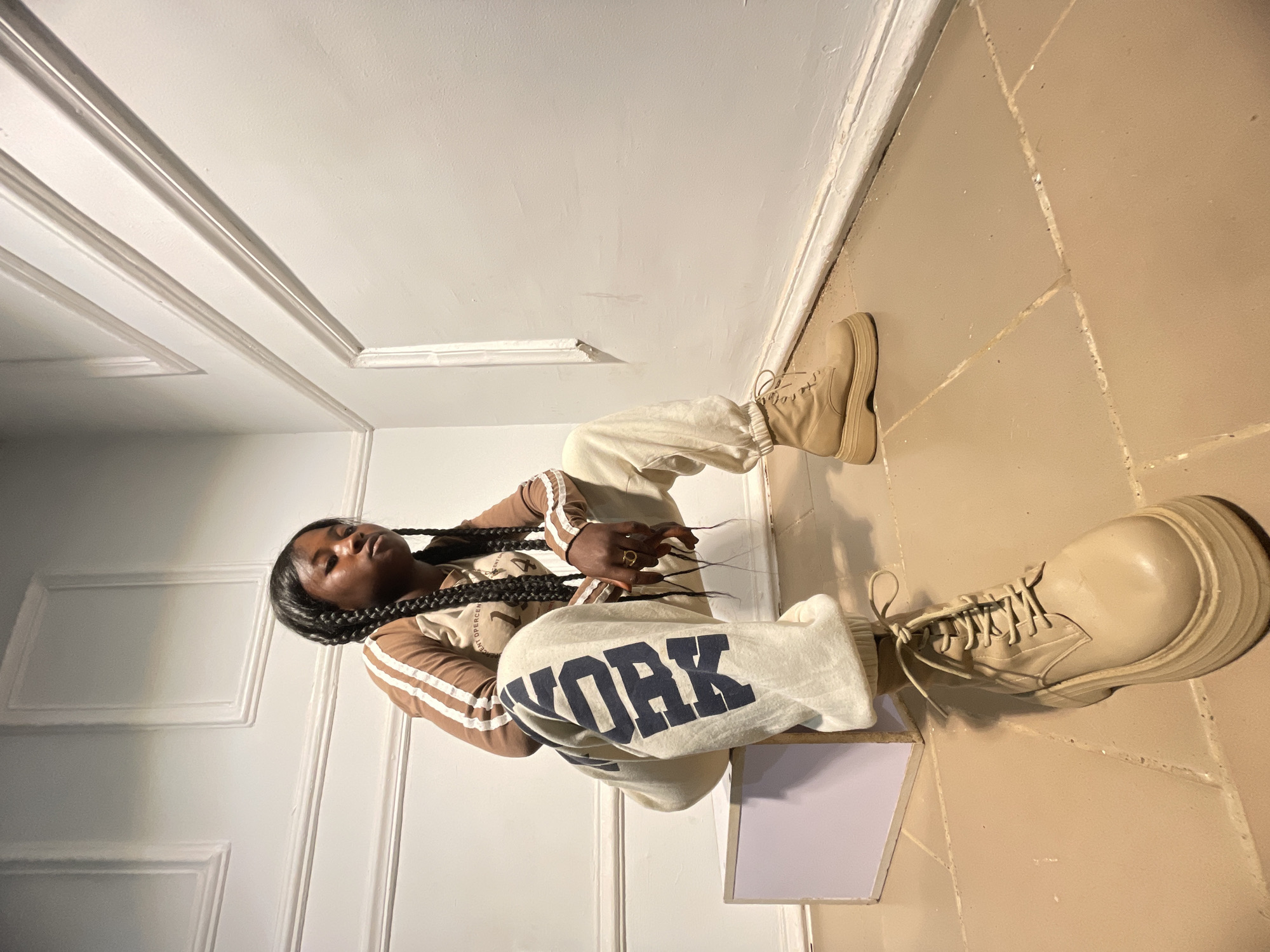 Within a corner of a room in Barakin Akawo, Nigeria, a young individual with dark skin and long, dark braided hair is seated in a crouched posture. They wear a light brown and beige long-sleeved shirt with white stripes on the sleeves and text including "PERCENT OPERCENT" and "194" on the chest. Light beige sweatpants with "NEW YORK" printed vertically in dark blue on the left leg, and thick-soled beige lace-up combat boots complete their attire. The individual's eyes are closed or cast downwards, and a ring is visible on their right hand. They are positioned on a small, white rectangular box. The immediate environment features a light-colored wall with decorative white paneling and molding, forming rectangular frames. The floor consists of light brown square tiles with visible grout lines and minor particulate debris. A white baseboard runs along the wall at floor level.