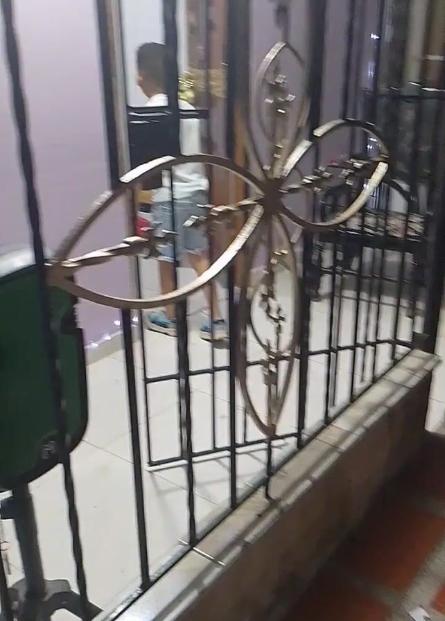 metal gate with decorative elements from a low angle, looking upward. Beyond the gate, there's a glimpse of a room with a person visible in the reflection. The camera then pans down to show a brick floor, a white box on the floor, and a sandy or dirty ground area. The camera work is shaky and the footage is somewhat unclear.