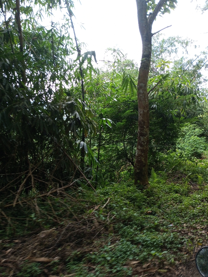 The image displays a dense, verdant natural environment located in Matale, Sri Lanka. The scene is dominated by a variety of green foliage under an overcast sky. Numerous tall, slender bamboo stalks are visible on the left and extend into the background, forming a thick canopy. A single, prominent tree with a light brown trunk stands centrally on the right side of the frame. The ground is covered with dense green undergrowth, consisting of various low-lying plants, possibly including ferns. In the lower-left quadrant, a collection of dry, snapped branches rests on the ground. A partial, circular, dark object, consistent with a vehicle's side mirror, is visible in the lower-right corner. No human or animal subjects are present.
