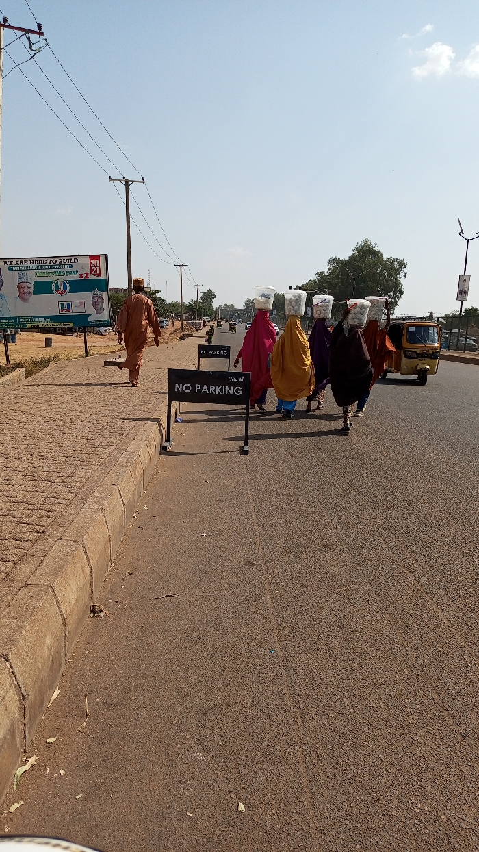 The image depicts a daytime street scene in Hayin Banki, Nigeria, under a clear blue sky with minimal cloud cover. In the mid-ground, a group of six individuals, predominantly dressed in long, flowing garments of varying colors including pink, yellow, purple, and brown, walk away from the viewer on an asphalt road. Each carries a white or light-colored bucket filled with numerous spherical objects balanced on their head. To their right, a yellow and black motorized tricycle (Keke Napep) is partially visible, also moving away from the camera. Two black "NO PARKING" signs with white lettering, one bearing "UBA" branding, stand on metal frames directly on the asphalt between the viewer and the group of individuals. On the left side of the frame, a paved sidewalk constructed from interlocking bricks runs parallel to the road. A lone male individual, dressed in a light brown traditional long garment and cap, walks on this sidewalk, also moving away from the viewer. He appears to be carrying a dark, flat object in his left hand. Further left and behind him, a large billboard displays political campaign messaging, including the phrase "WE ARE HERE TO BUILD...", the year "2021", and images of several men, along with what appears to be an "APC" logo. Multiple wooden utility poles with overhead power lines extend into the distance along the left side of the road. Sparse trees and distant structures are visible in the background, contributing to a somewhat hazy horizon. The road surface is dark asphalt, and the sidewalk is light brown.