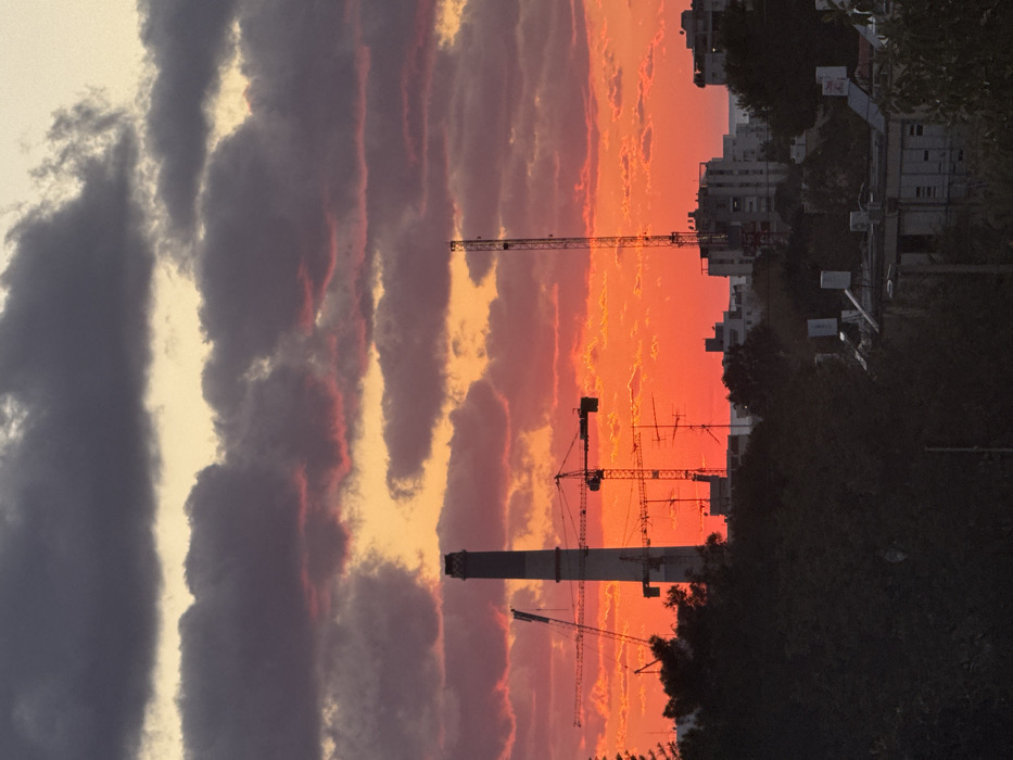 The image depicts an urban and industrial skyline at sunset, specifically located in the vicinity of the Reading Power Station in northern Tel-Aviv, Israel. The sky is dominated by a dramatic sunset, featuring a brilliant orange and deep red horizon that transitions upwards through fiery orange, pink, and purple hues, capped by heavy, dark grey cumulus clouds. In the midground, a prominent, tall, cylindrical industrial chimney, characteristic of the Reading Power Station, stands left of center, appearing bicolored with a lighter grey shaft and a darker band near its flat top. To its left and right, several large construction cranes are silhouetted against the bright sky, including at least two tower cranes. Numerous smaller antenna-like structures are visible in the same area. To the right of the chimney, another very tall, slender lattice tower rises. Below these major structures, a densely packed urban environment is visible. Multiple multi-story buildings are silhouetted, some appearing to be under construction or renovation, with visible scaffolding or unfinished sections. A faint horizontal line on the distant horizon, likely the Mediterranean Sea, is visible behind the buildings on the right side. The foreground consists of dark silhouettes of dense tree foliage on the left and central-bottom, partially obscuring the immediate ground level. On the lower right, portions of a building with rooftop antennas or satellite dishes are discernible. No people or specific actions are visible in the static scene.