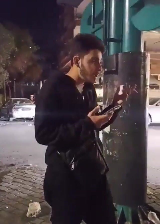A person is standing on a sidewalk at night. The person is wearing black clothing and has a dark beard. They are holding a smartphone and looking at it. They are gesturing with their hands as if they are talking to someone on the phone. There are several cars parked on the street behind the person. The street is lit by streetlights.