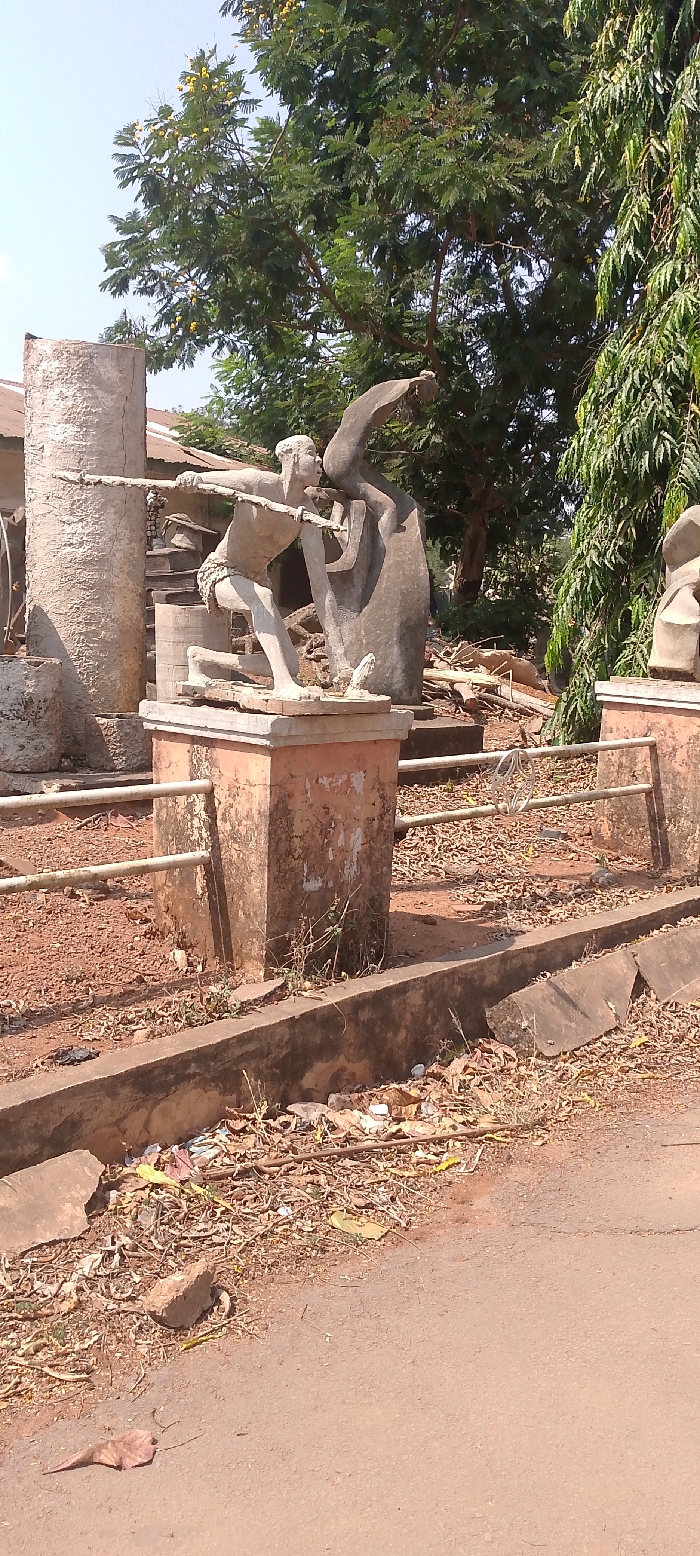The image depicts an outdoor scene in Nsukka, Nigeria, under clear daylight. In the midground, two weathered sculptures are positioned on light-brown concrete pedestals. The prominent left sculpture is a stylized human figure, likely male, rendered in light-grey concrete, crouched in a dynamic pose holding a horizontal staff or spear. Behind it to the right stands a larger, abstract sculpture of dark grey, composed of vertical, curved forms. The pedestals exhibit signs of wear and discoloration. A low, galvanized metal railing, featuring a circular silver ornamental motif, connects the pedestals. The immediate ground level surrounding the sculptures and railing is dry, reddish-brown earth heavily covered with dried leaves, small branches, and minimal sparse vegetation. A concrete drainage channel, containing dried leaves, dirt, and miscellaneous litter, runs along the foreground, separating the elevated ground from a reddish-brown, compacted dirt or asphalt road surface visible in the lower right. In the background, dense green foliage from several trees dominates the upper and right portions; one tree displays yellow blossoms. Portions of low-rise buildings with corrugated metal roofs and additional weathered concrete structures, including a tall, cylindrical pillar, are visible on the far left. The sky in the upper left is clear and light blue.