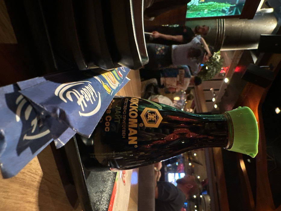 The scene depicts a close-up of a dining table inside a restaurant or similar establishment located in Sofia, Bulgaria. In the foreground, a dark Kikkoman soy sauce bottle with a vibrant green plastic cap stands prominently on a black, rectangular serving tray. The bottle label is visible, displaying "KIKKOMAN" in English and Cyrillic text reading "ЕСТЕСТВЕНО ПРИГОТВЕН ЛАЙТ Соев Сос" (Naturally Brewed Light Soy Sauce). To the left of the bottle, also on the black tray, rests a folded blue paper wrapper for chopsticks, featuring a white "Happy" logo and additional colorful patterns. Stacked black, rectangular dishes are partially visible to the immediate left of the chopstick wrapper. The background is out of focus, revealing a dimly lit interior with warm ambient lighting. Several individuals are present: * On the far left, a blurred green-lit aquarium or display is visible next to a dark, cylindrical structural element. * In the mid-ground left, a man with a beard, wearing a dark shirt, stands with his right hand holding a thin, white object, possibly a chopstick. * To his right, another person with long, dark hair appears to be adjusting their hair or tying it up, wearing a light-colored top and a patterned skirt or trousers. * Further to the right, a person in a distinctive blue and white patterned shirt is partially visible. * On the far right, seated at a table, a man with a beard and dark shirt is engaged in an activity, his profile visible. The overall environment suggests a casual dining atmosphere with multiple patrons. Wooden or wood-toned surfaces are discernible in the ceiling and table areas.