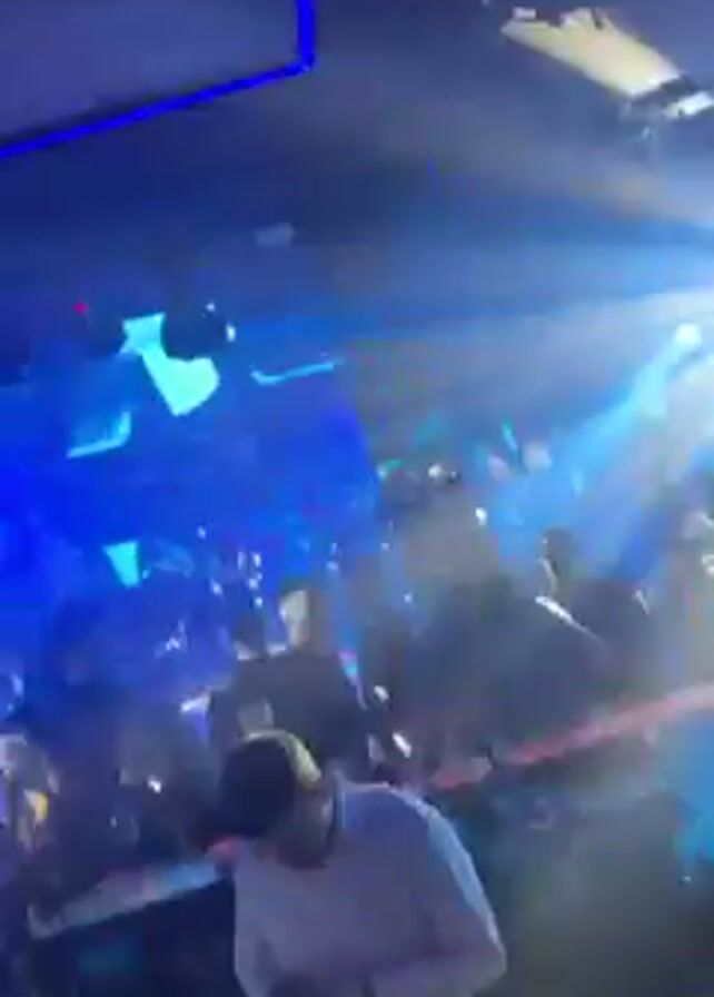 The video depicts a crowded nightclub scene. The space is dimly lit with primarily blue lighting and laser beams. A crowd of people are gathered, their movements suggesting dancing or general activity in the lively atmosphere. In the foreground, a bar is visible with someone standing behind it, though their actions are obscured by the crowd.