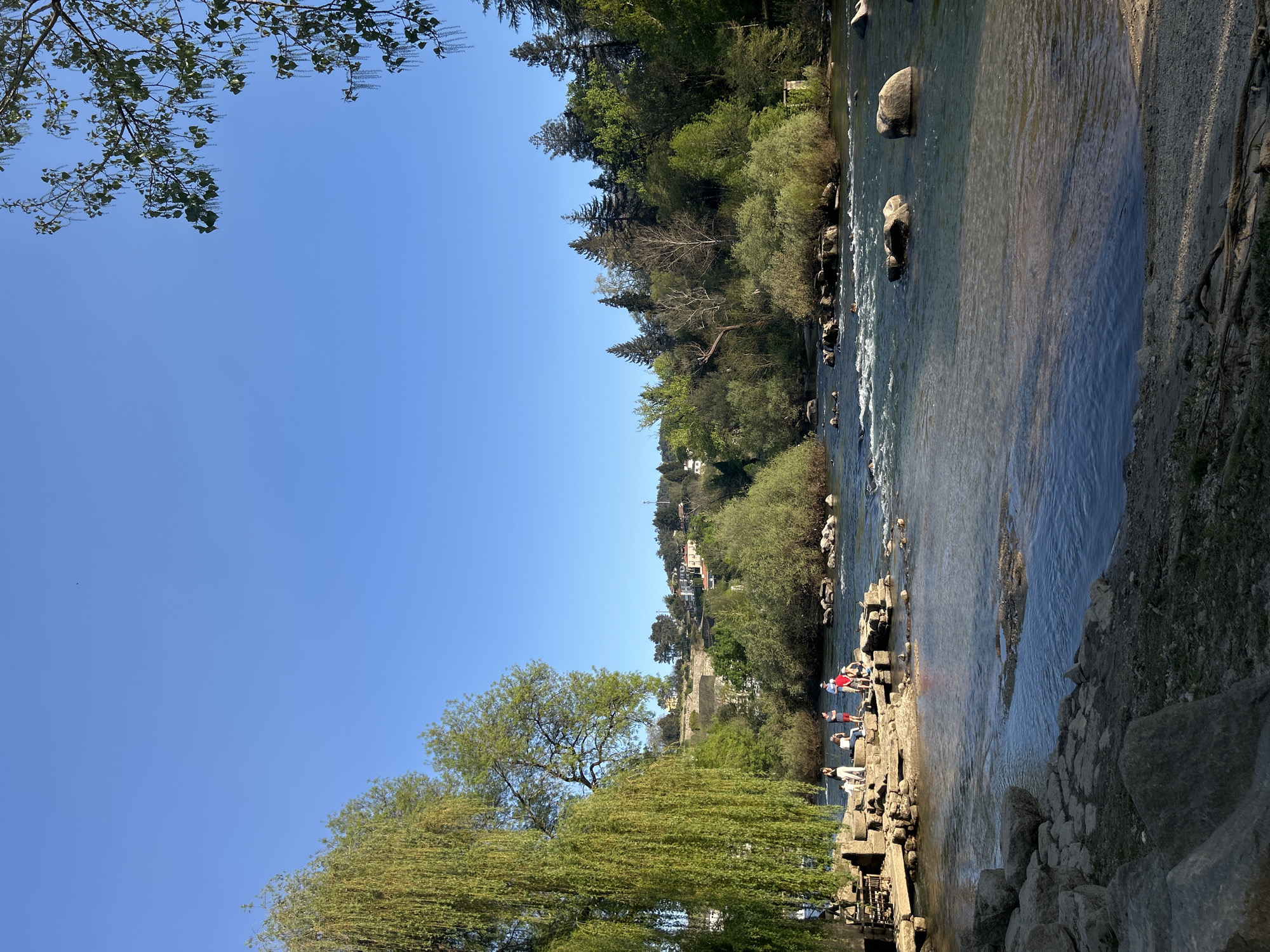 The image depicts a riverside scene in Amarante, Portugal. The river, with visible rocks, flows from the upper right to the middle ground. People are standing and interacting on a series of stone platforms near the water's edge. Vegetation, including trees and shrubs, lines both sides of the river. The sky is clear and blue. Buildings are visible further inland on the far bank, suggesting the location is within the urban environment of Amarante.