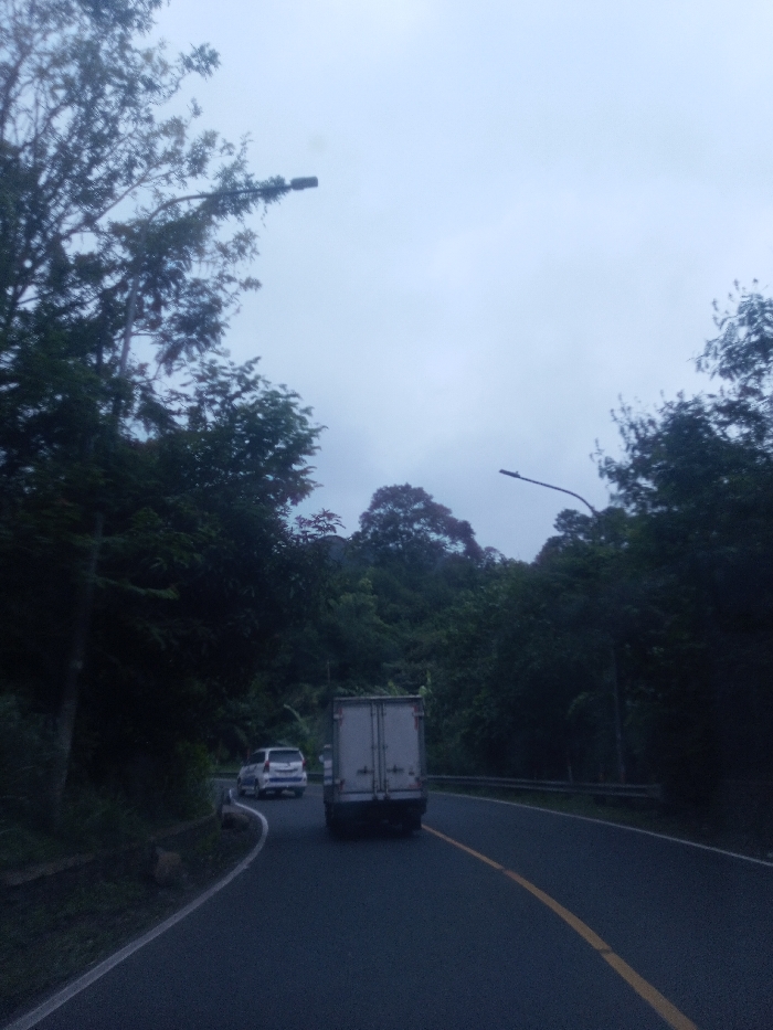 The image depicts a winding asphalt road, likely within or near Jabalpur, India, surrounded by dense green foliage under an overcast sky. The lighting is dim, suggesting a heavily clouded day, dusk, or dawn. The perspective is from a vehicle moving forward. In the immediate foreground, the road features a solid white line marking its left edge and a continuous yellow line near its center. Ahead, a light-colored box truck, with a visible rear cargo section, occupies the right side of the lane, moving away from the viewer. Further down the road, behind the truck, a white SUV or minivan is visible, also in motion, following the truck. Dense trees and vegetation line both sides of the road, forming a natural barrier and extending up a hillside in the background. Two streetlights are visible; one on the left, closer to the foreground, extends over the road, and another, further down on the right, also extends over the road. A metal guardrail is partially visible along the right edge of the road, adjacent to the foliage. No individuals are discernible within the frame.
