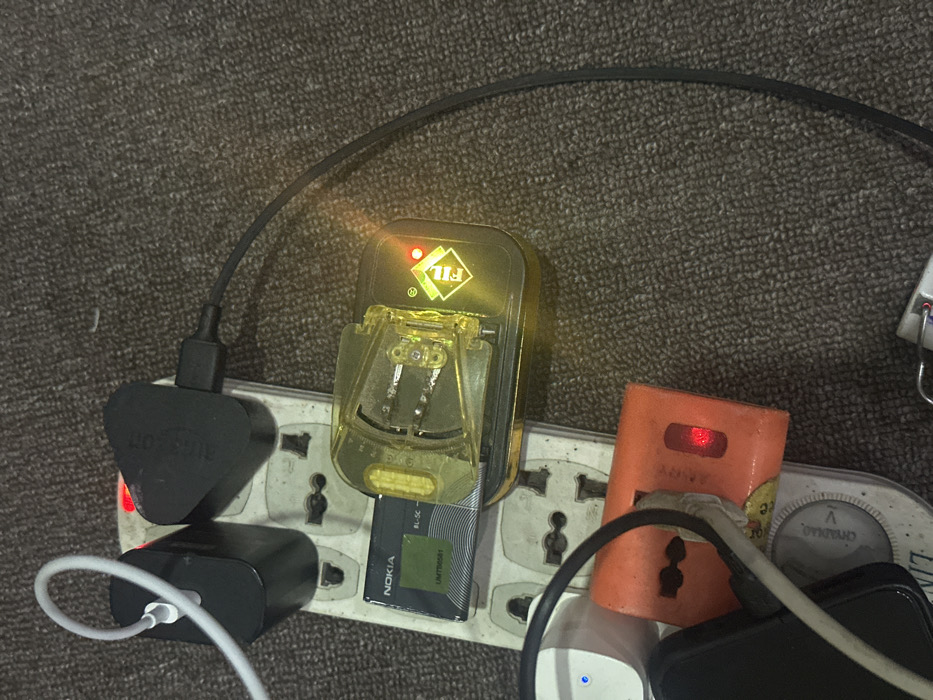 An overhead view depicts a white multi-socket power strip resting on a dark grey, short-pile carpet in Sabon Tasha, Nigeria. Multiple electronic devices are plugged into the power strip. From the top left, a black rectangular USB charger is connected, with a white cable extending from it, and a red indicator light illuminated. Adjacent to it, a black, triangular "Aussion" brand power adapter is plugged in, featuring a red indicator light and a black cable. Below these, a translucent yellow "FIL" brand universal battery charger is actively charging a black Nokia BL-5C battery, evidenced by two illuminated red indicator lights on the charger. To the lower left, a white charger with a blue indicator light is partially visible, connected to the power strip. An orange plug or adapter, partially obscured, is also connected, displaying a red indicator light.