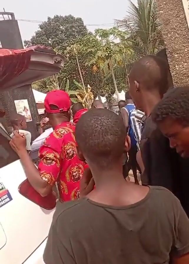 The scene is a gathering of people, mostly young males, seemingly outdoors. The camera's point of view is from within the crowd, focusing on a man in a red patterned shirt and a red cap who raises his arm. Some individuals are dressed casually, while others sport distinct outfits, like a vibrant multicolor jumpsuit. There's a white vehicle nearby, its trunk open and lined with red fabric, and a speaker system is adjacent to it. The backdrop features trees and a wall with a posted sign.