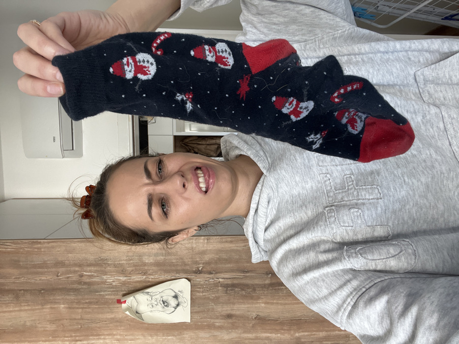 An indoor scene features a light-skinned female individual with light brown hair secured in a high bun with a brown claw clip. She wears a light grey hooded sweatshirt with "OFF" in distressed white lettering across the chest. Her facial expression conveys strong disapproval, characterized by a wrinkled nose, squinted eyes, and a slightly open mouth with the tongue partially visible. She holds a single dark blue/black sock in her left hand, which displays a festive pattern of white snowmen with red hats, red candy canes, and white snowflakes, along with red heel and toe sections. The sock appears to have lint or light fibers adhered to its surface. A ring is visible on her left ring finger. The background to the left consists of a wooden-paneled surface, possibly a door or cabinet, to which a small, light-colored paper drawing of a caricatured bearded man with a hat is affixed with a red clip at the top. To the right, a white wall hosts a white split-system air conditioning unit mounted high. Below the unit, an adjacent area is visible, containing a garment on a hanger and a white clothes drying rack. The specific location within the city of Bar, Montenegro, is not discernible from the provided visual information.