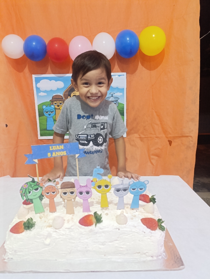 A young boy smiles widely behind a birthday cake. The square cake is decorated with white frosting, strawberries, and a set of cartoon character cake toppers. A blue banner on sticks reads "LUAN 5 ANOS". Behind the boy, six balloons in white, blue, red, pink, blue, and yellow are strung across an orange fabric backdrop. A cartoon poster of cartoon figures is also visible. The child wears a gray t-shirt with a car graphic and "Dept" and "Dangerous" text.